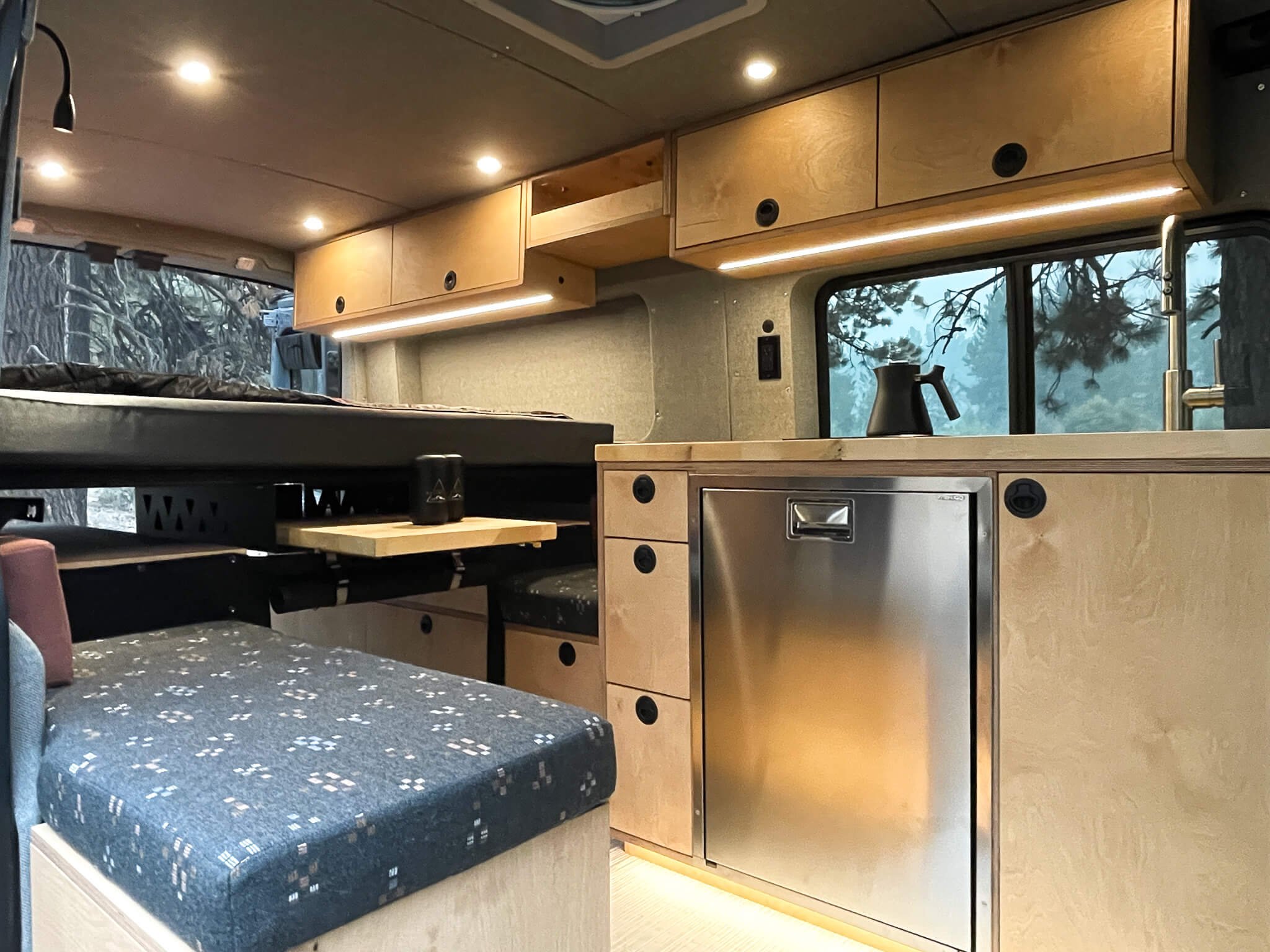 You’d be a fool for not loving STANLEY…Idaho or this van. Custom designed for a four-season adventure loving Idahoan—Stanley is dialed to take her anywhere, anytime of the year. From the Sawtooth’s to Bogus Basin or the Alvord Desert to the mountain biking trails of Bend, every detail and comfort designed and built into a Transit AWD 350 platform.