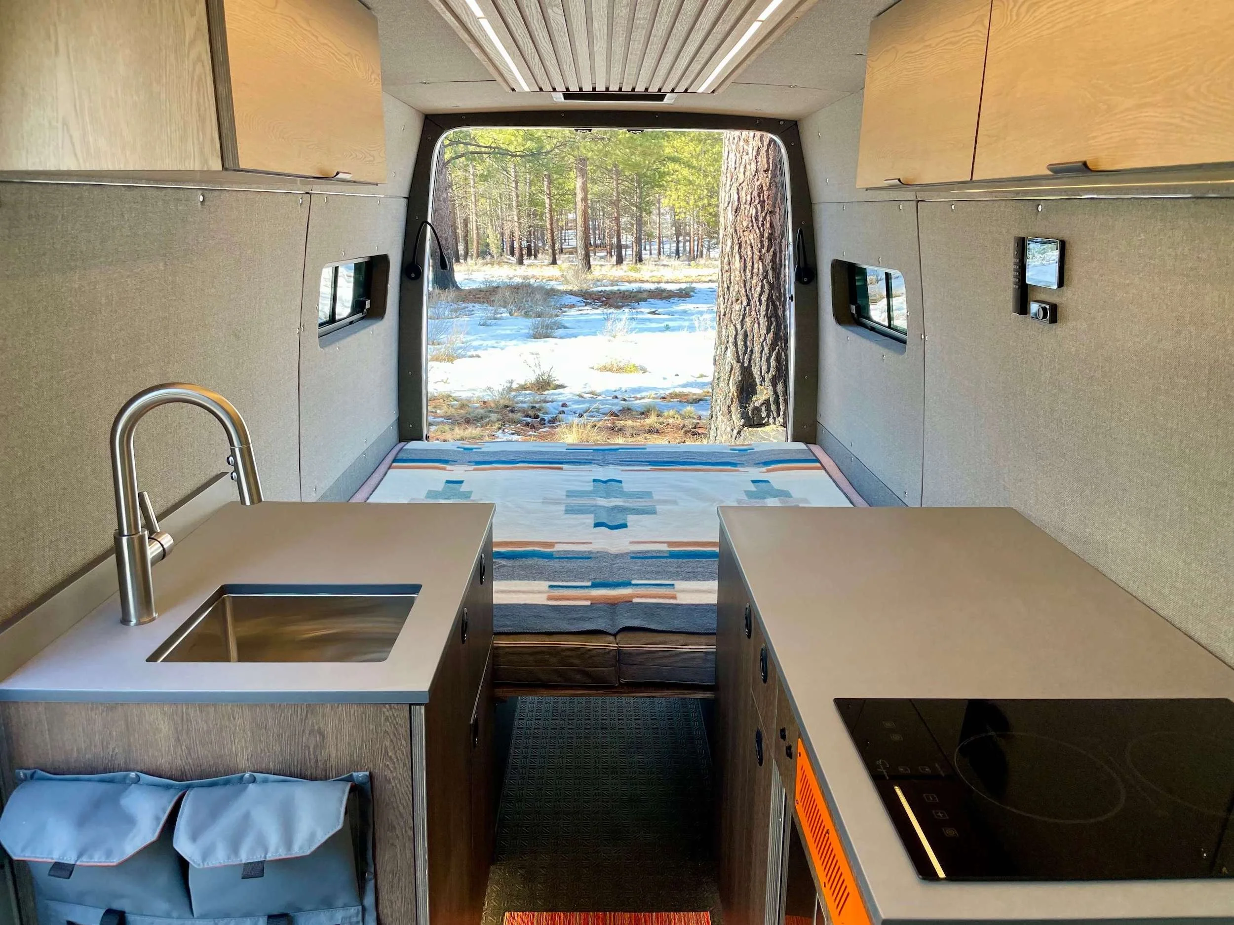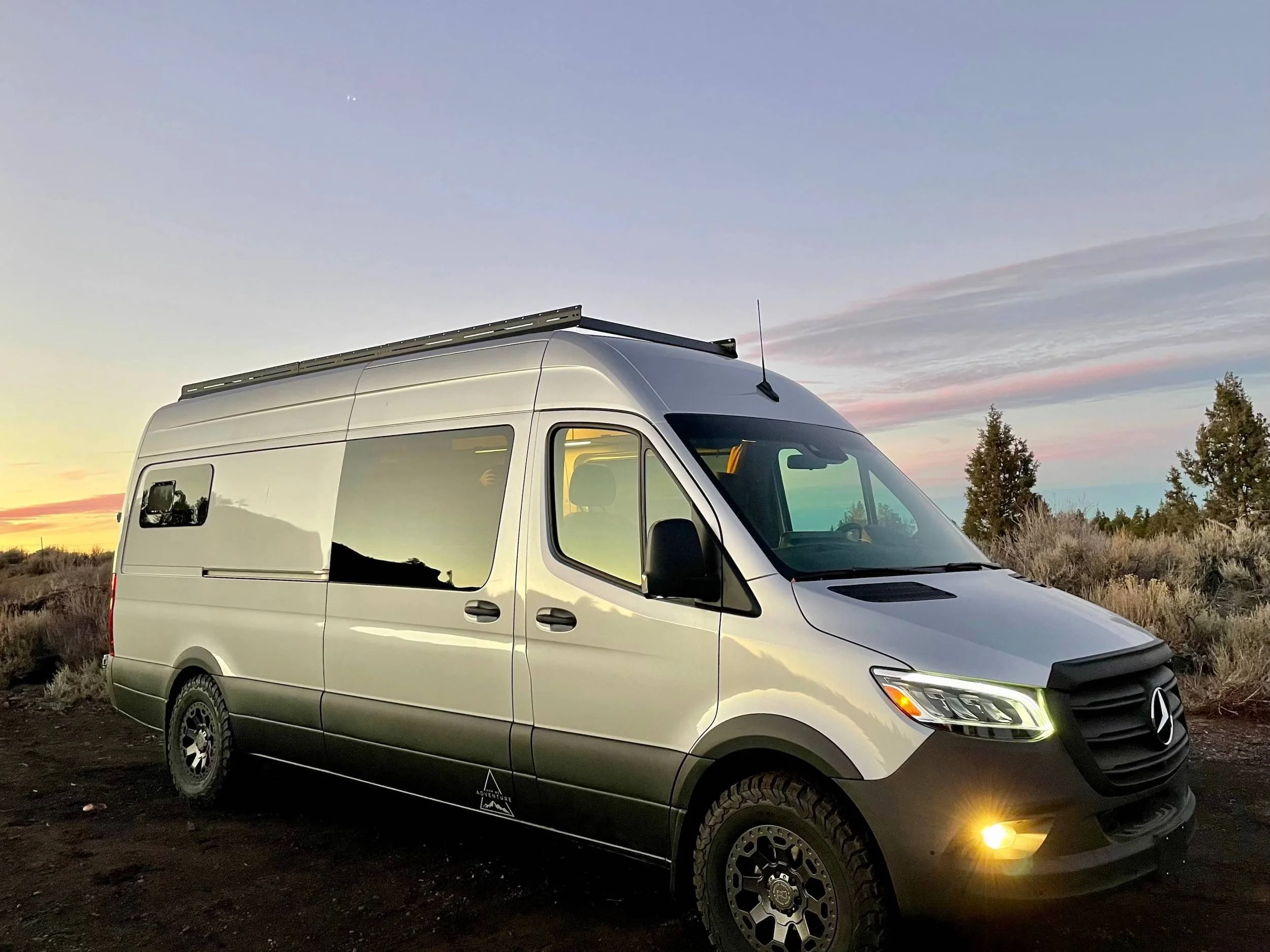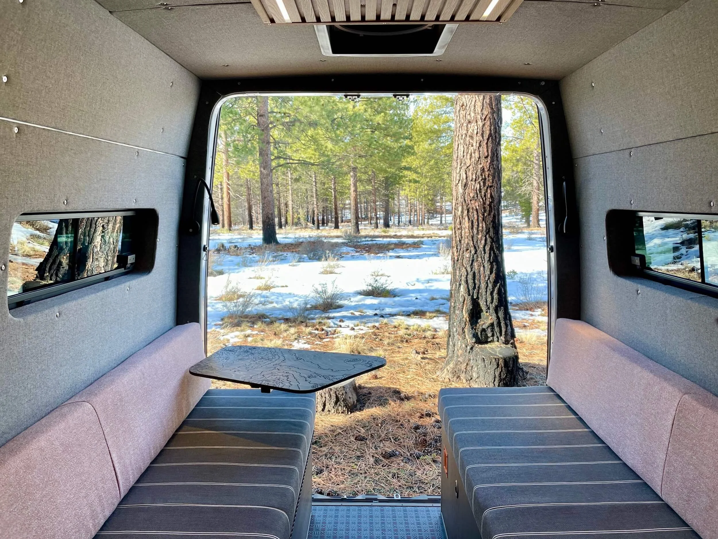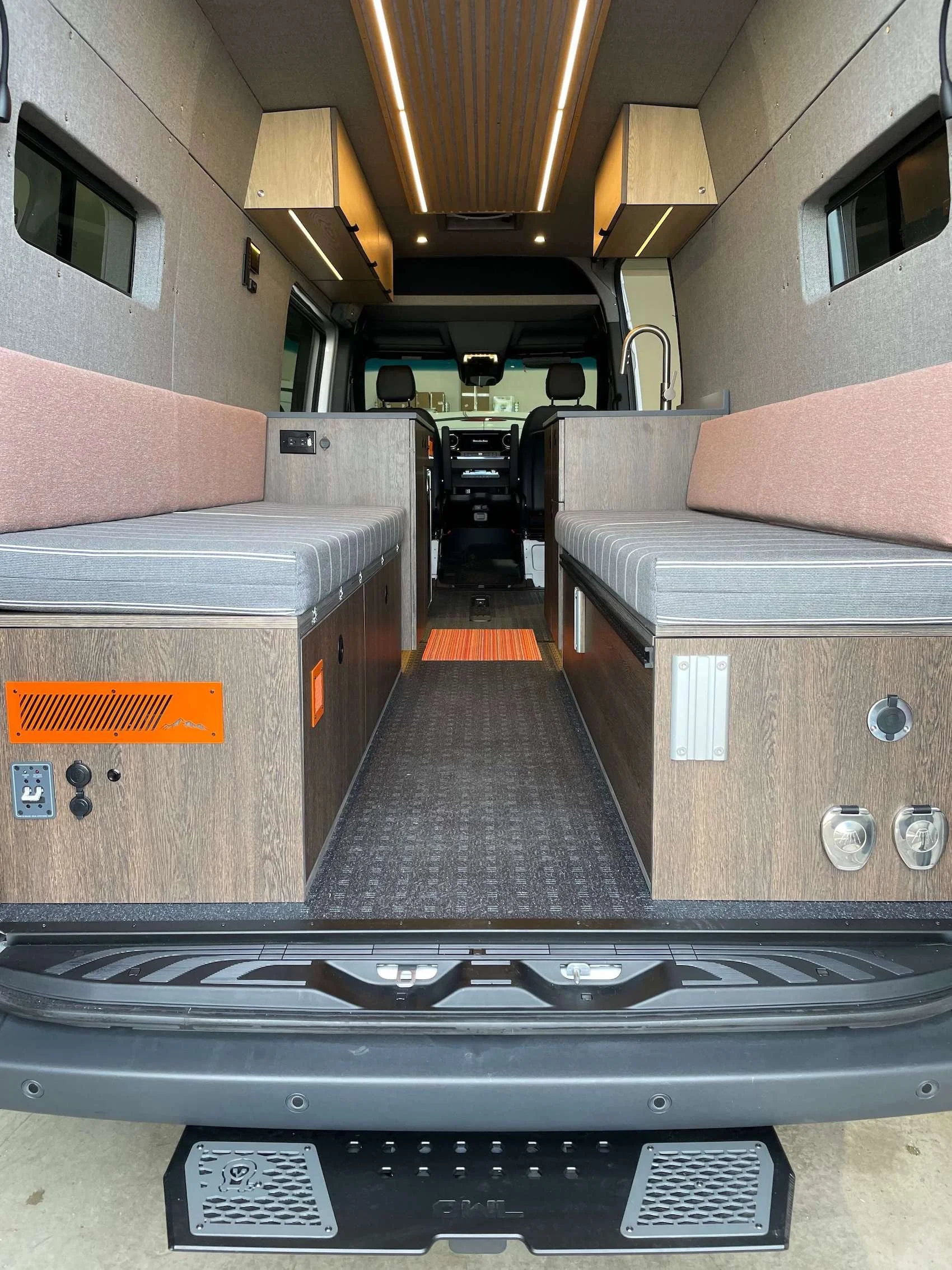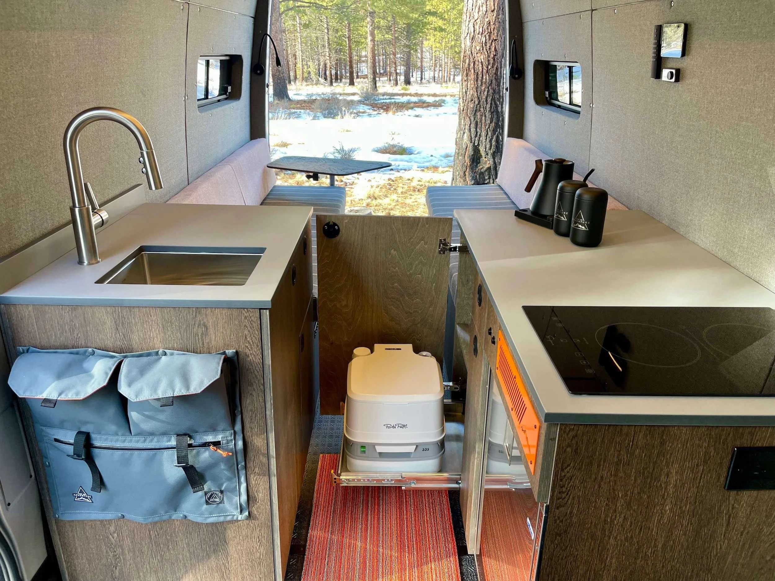 If you MTB in Bend, OR you’ve likely shuttled up to Swampy for the long ride back along Mrazek trail. We named this build after a favorite trail because it’s a long one. It’s also a screaming good time through the forests, guaranteed to put a smile on your face—just like this 170” Sprinter. Mrazek comes loaded with close to every option Mercedes offers. Starting with that solid base, we’ve expertly tuned it for adventure with an upgraded Van Compass stage 2 adjustable suspension kit, 17” Black Rhino Wheels and KO2 tires. Seating for 5 passengers with a removable Mercedes factory crew seat, two separate galley spaces, ample storage cabinets and two rear bench seats—one of which contains a hot water shower, that fold to create a queen size sleeping platform in night mode.